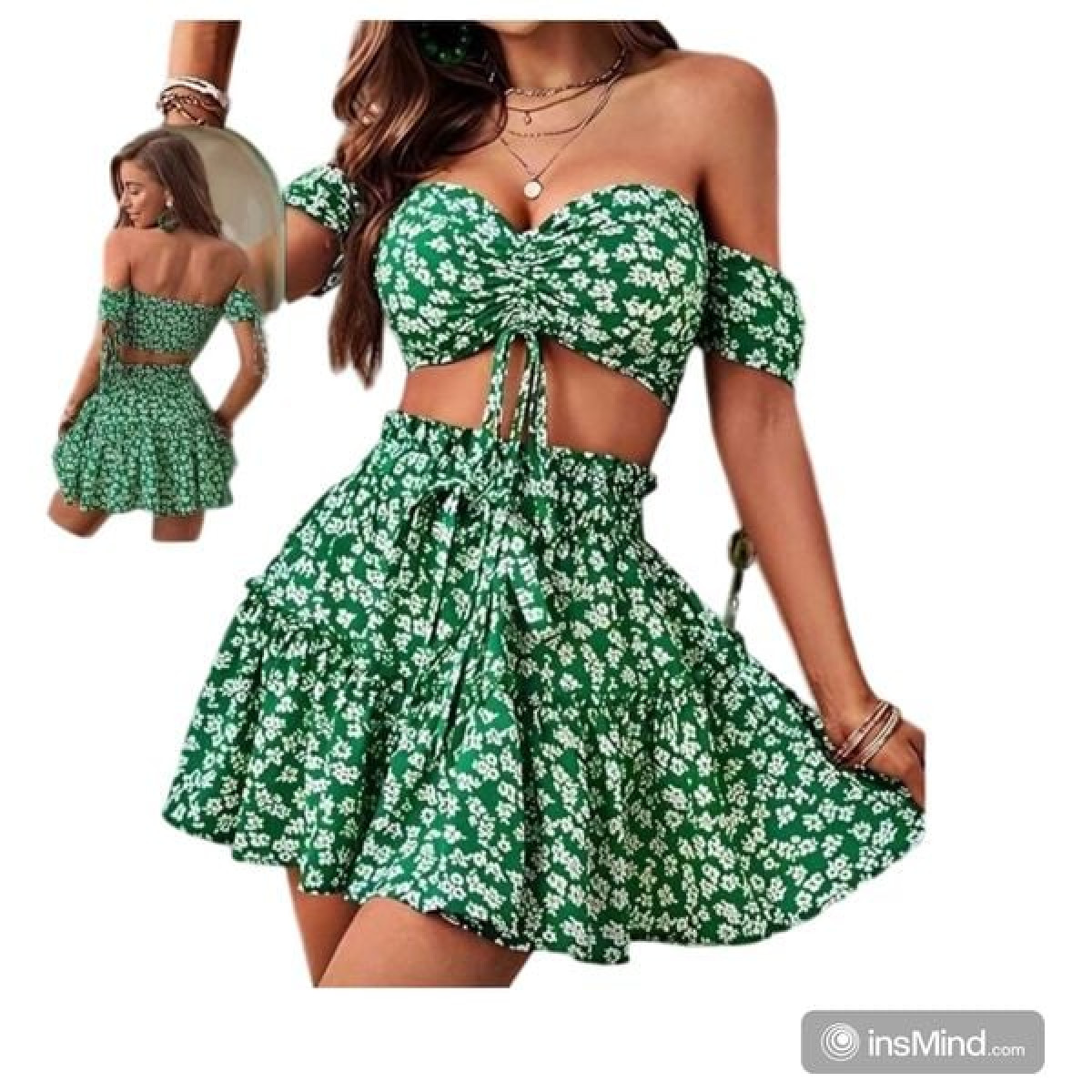 طقم صيفي أنيق مصنوع من قماش خفيف ومريح يناسب أجواء الصيف والربيع. يتكوّن من بلوزة قصيرة بأكمام أوف شولدر مع ربطات أمامية، وتنورة قصيرة عالية الخصر بتصميم مكشكش يمنح حركة وانسيابية. يتميز بنقش زهري باللونين الأخضر والأبيض لمسة منعشة وجذابة. مثالي للرحلات، البحر، الحفلات، والخروج اليومي، وسهل التنسيق مع كعب أو صندل مسطّح لإطلالة متكاملة.