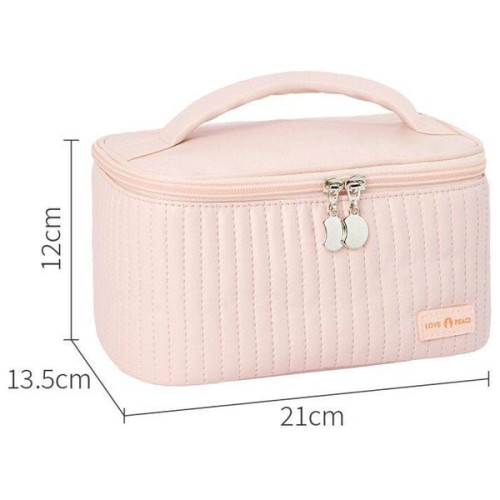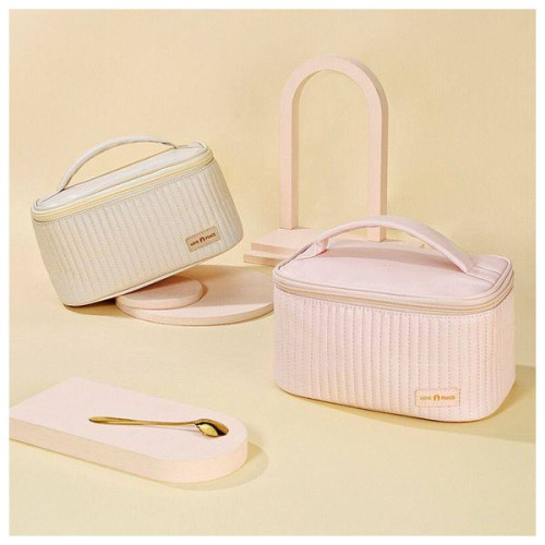 حقيبة Love Peace منظم مكياج باللون الكريم مبطنة ومصممة للحفاظ على أدوات المكياج ومستحضرات العناية بالبشرة بشكل مرتب. فتحة علوية واسعة للوصول السريع، وجيوب داخلية لحفظ فرش المكياج، ومساحة رئيسية واسعة تتسع للزيوت والكريمات وأدوات التجميل المختلفة. خامة قماش متينة سهلة التنظيف مع سحاب مزدوج ومقبض علوي مريح. مناسبة للاستخدام المنزلي والسفر.