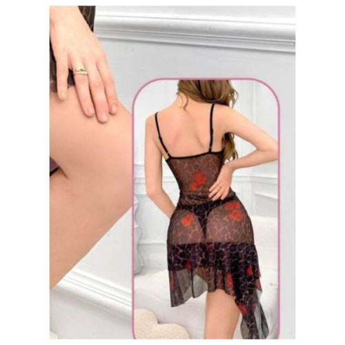 فستان نوم نسائي شفاف مزهر بتصميم أنيق - احمر