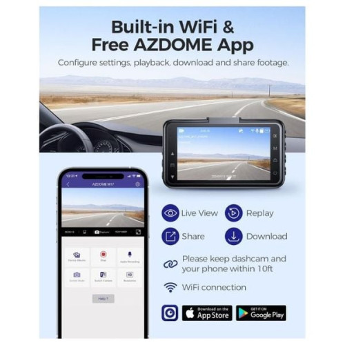 - لعرض ونقل التسجيلات مباشرة عبر تطبيق AZDOME على الهاتف (يدعم Android وiOS).