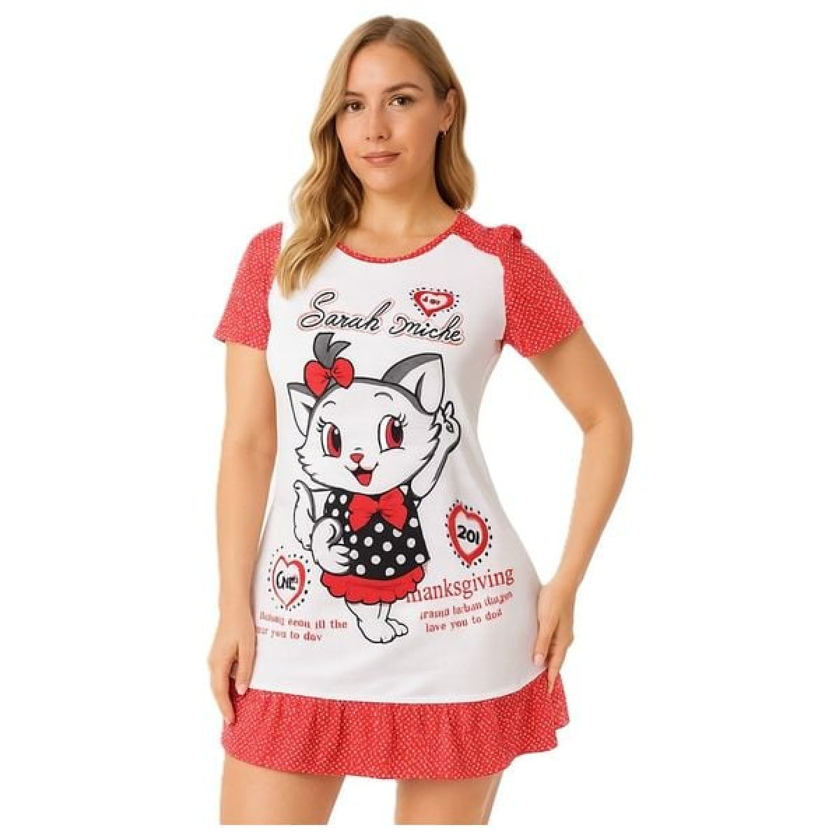 فستان نوم نسائي واسع ومريح مصنوع من قماش قطني ناعم وخفيف، مزين برسمة كارتونية لطيفة لقطة. متوفر بعدة ألوان، مناسب للنوم، الجلوس بالبيت، أو استقبال الضيوف بشكل أنيق ومحتشم، وخامته قابلة للغسل المتكرر مع الاحتفاظ بالجودة